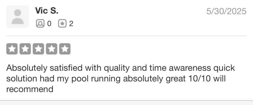 Rene, the owner, came and installed a new pump quickly and efficiently, and everything is working perfectly. He was professional, knowledgeable, and took the time to explain what he did. Highly recommend for any pool repairs/installations.
