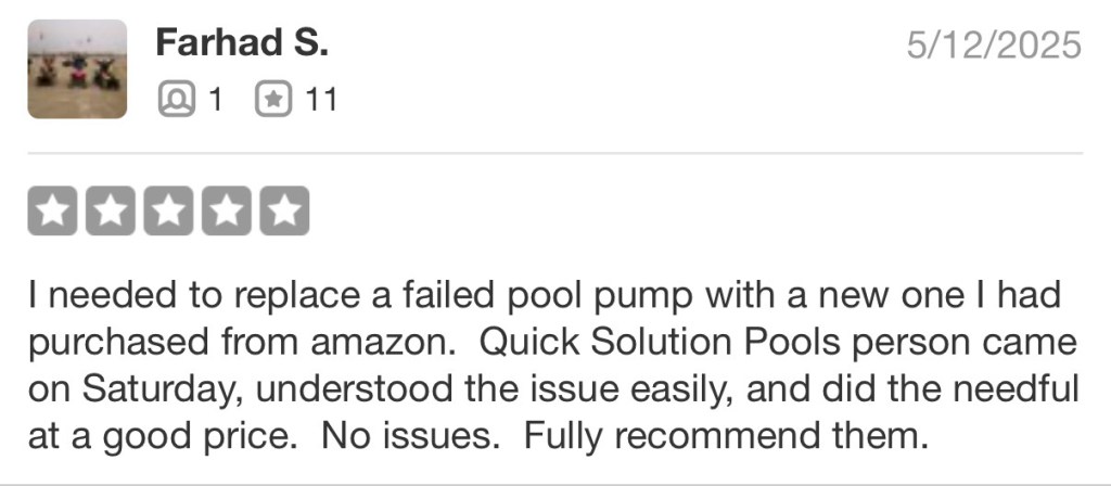 Quick Solution Pools was A+ right from the time I sent the first message to the time they completed the work. Thank you very much for replacing my pool pump. A++++
